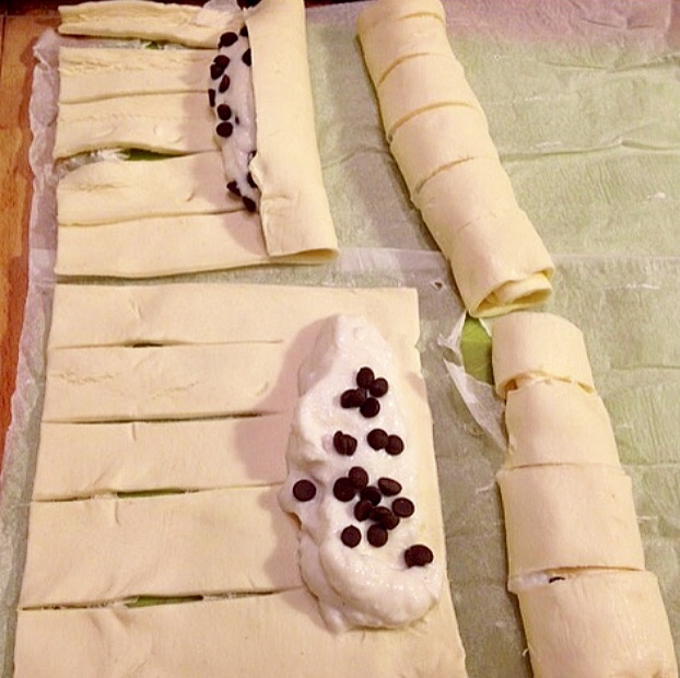 - in ogni quadrato mettere una parte di crema ricotta e aggiungere le gocce di cioccolato ( vedi post)