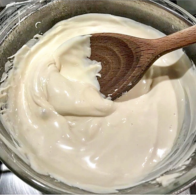 - Sciogliere il cioccolato bianco a bagnomaria o al microonde, aggiungendo 1 cucchiaino d’olio di semi di mais