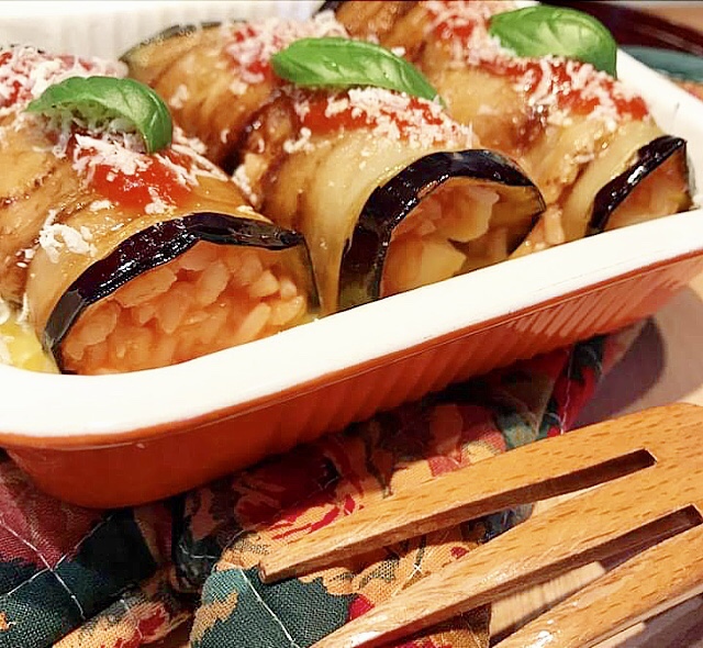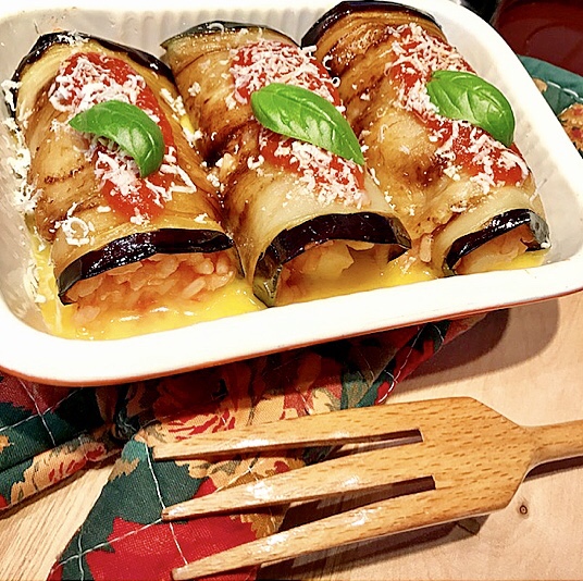 - farcire ogni fetta di melanzana con il composto di riso mettendo al centro un listello di formaggio