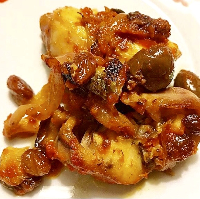 - in un tegame da forno, sistemate i tranci di coniglio precotti, aggiungendo la cipolla rossa affettata, la passata rustica di pomodoro, le olive, i capperi , l’uva sultanina, il sale e l’olio