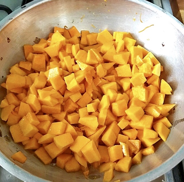 - per prima cosa saltate i cubetti di zucca con 1 cucchiaio di zucchero semolato ( preso dal totale) insieme al succo di limone, poi sfumate con il liquore