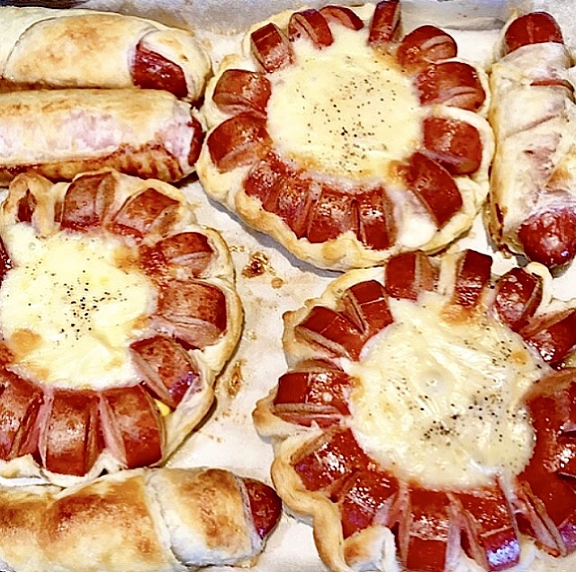nella foto vedete anche dei rotolini di würstel, dal detto in cucina non si spreca niente, con la pasta sfoglia avanzata ho avvolto dei piccoli würstel e poi li ho spennellati con l’albume!