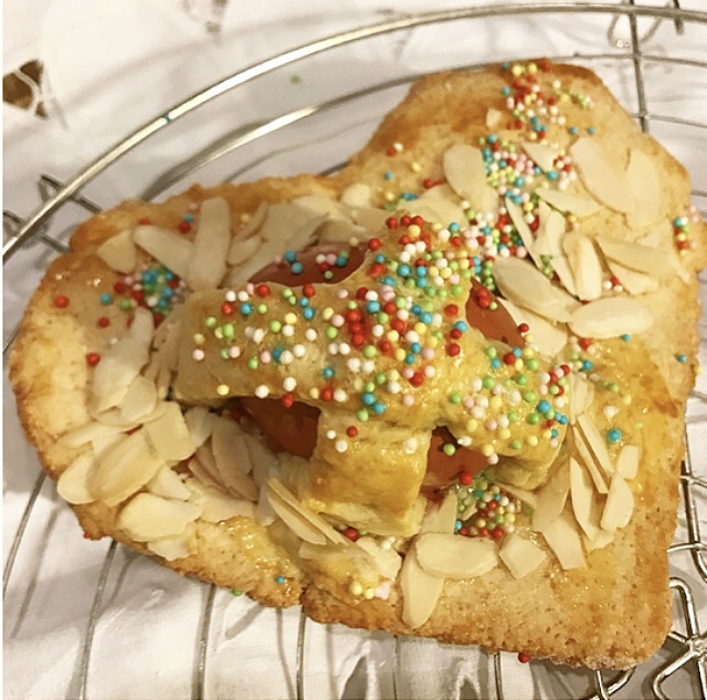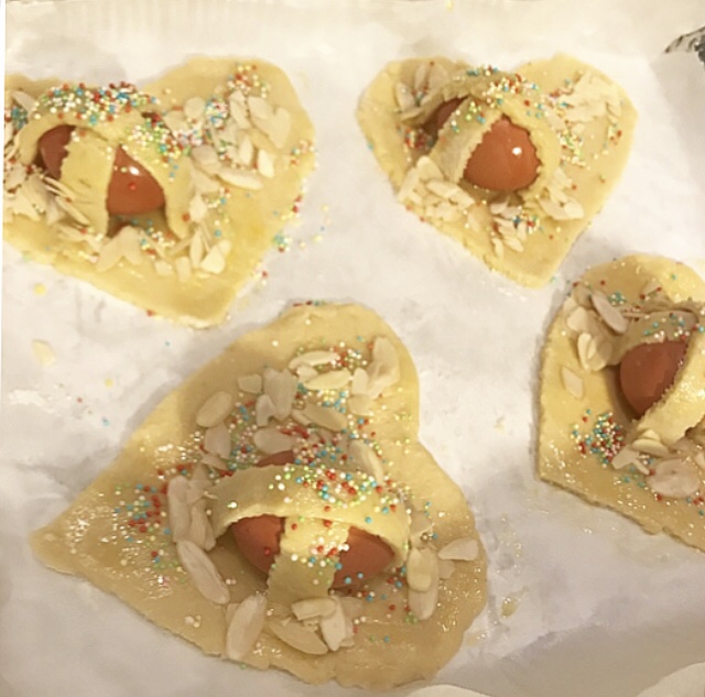 - spennellare con l’uovo sbattuto ogni cuore ricavato, mettere al centro l’uovo sodo e coprirlo con 2 striscioline, dando la firma a Croce ( spennellare le striscioline