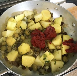 - in un capiente tegame basso, fare rosolare la cipolla affettata con le patate tagliate a cubotti insieme alle olive , i capperi e l’uva sultanina