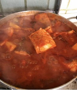- aggiungere 1 bicchiere d’ acqua ( per sciogliere le salse) e lo stoccafisso precedente lavato sotto l’acqua corrente