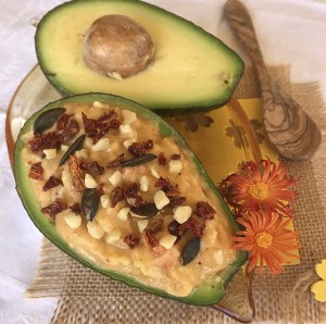 - servire la Guacamole nel suo stesso guscio e guarnire con granella di mandorle – semi di zucca – pomodori secchi tritati