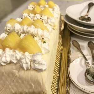 - rifinire con ciuffi di panna montata, tocchetti di ananas e granella di pistacchio