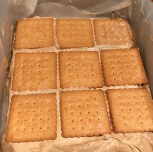 - foderare il tegame con la carta forno e adagiare 12 biscotti ( leggermente distanziati )