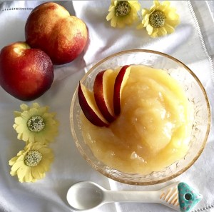 - aiutandosi con un mixer ad immersione , frullare la polpa di pesche con 100 gr d’acqua naturale e il succo di 1/2 limone