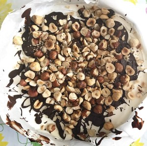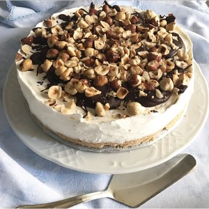 - riprendere la torta dal freezer e aiutandosi con un cucchiaio spruzzare la torta con il cioccolato fuso e aggiungere le nocciole tostate