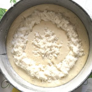 - impastare il cocco rapè con lo yogurt, l’amido di mais e il latte ( dovrà risultare compatto e morbido da poter lavorare con le mani)