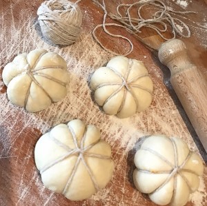 - chidere il panetto formando una piccola palle e con lo spago avvolgerla come fosse un pacchetto regalo , ripetendo per 6 volte ( questo passaggio permetterà a dare ai panini la forma della zucca)