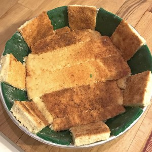 - a cottura ultimata lasciare intiepidire e poi tagliare la pasta biscotto in quadrati regolari ( per riempire i lati dello stampo) in listarelle per coprire la base dello stampo e in briciole per chiudere l’assemblaggio della ricotta