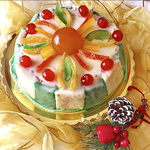 - stendere con un matterello la pasta di mandorla colorata ( aiutandosi con lo zucchero a velo per non farla attaccare nella spianatoia) e ricavare dei quadrati per rivestire i lati dello stampo