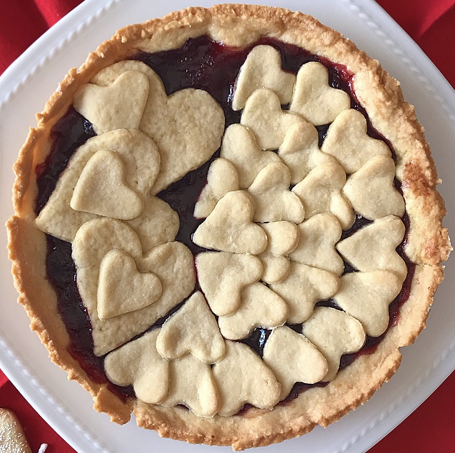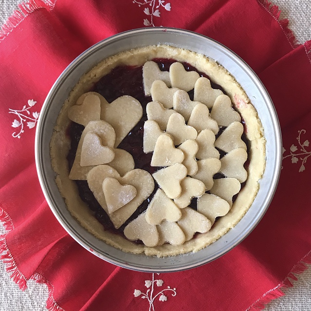- rivestire lo stampo con la frolla togliendo l’eccesso dai bordi, punzecchiare il fondo con i lembi di una forchetta e poi riempire con la confettura di amarene ( riporre in frigo)
