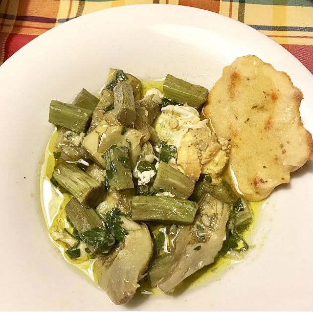 - Una ricetta della tradizione contadina siciliana, con protagonista i cuori di carciofo. Le nonne servivano questa pietanza in umido per inzuppare le fette di pane casereccio e le uova rotte, come si chiamavano un tempo, cioè le uova in camicia. Insieme ai carciofi si formava nell’uovo una sorta di camicia cioè un saccottino, dove racchiudeva tutto il sapore delle uova appena fatte dalle galline. In questa ricetta sono inseriti anche i gambi dei carciofi, perché come dicevano le nonne: non si buttava mai niente. Questa è la ricetta originale tramandata dalla mia famiglia. Viene servita in umido ( come mostra il successivo post) o soltanto l’uovo con i cuori di carciofo che fanno da contorno.
