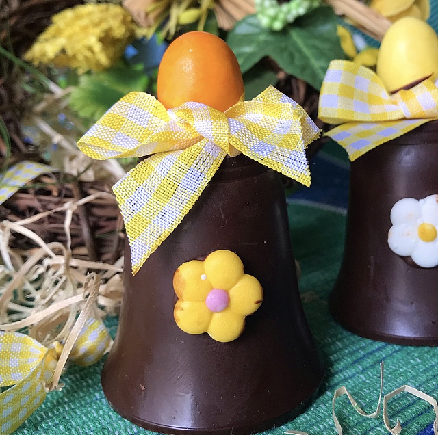 - La campana è il simbolo della Pasqua perché con i suoi rintocchi annuncia la resurrezione di Gesù!!! Queste campanelle sono state realizzate con il cioccolato, come segna posto o semplicemente per imbandire la tavola Pasquale! Carine anche da regalare se realizzate con uno stampo più grande, cioè un bicchiere di plastica per bevande! Si può inserire al suo interno un oggettino e poi, la campana infiocchettata con carta trasparente x alimenti, sarà un graditissimo regalo per le persone che amate!