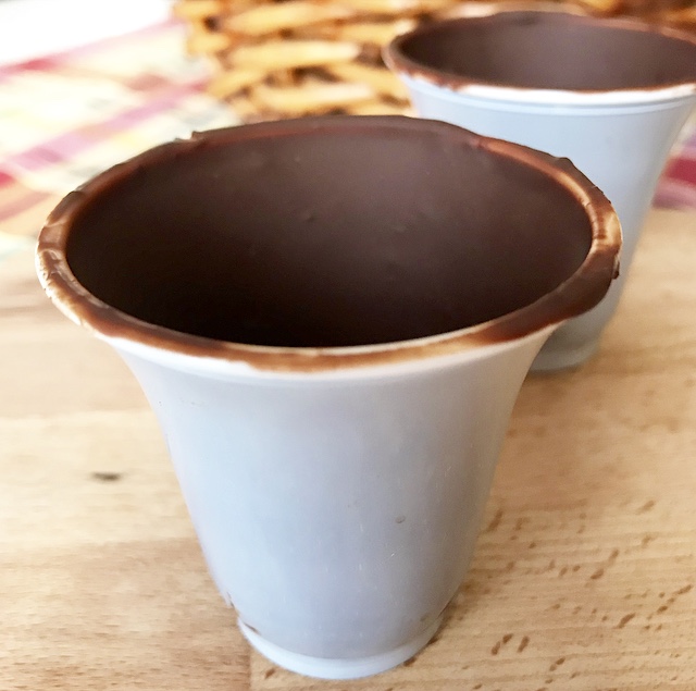 - lasciare leggermente intiepidire e poi versare un po’ di cioccolato fuso all’interno del bicchierino , roteando il cioccolato nelle pareti interne