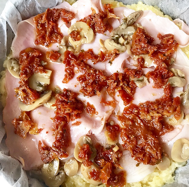 - farcire con il prosciutto, i funghi , i pomodori secchi ( tagliati al coltello), la mozzarella affettate e il formaggio a pasta morbida a cubotti