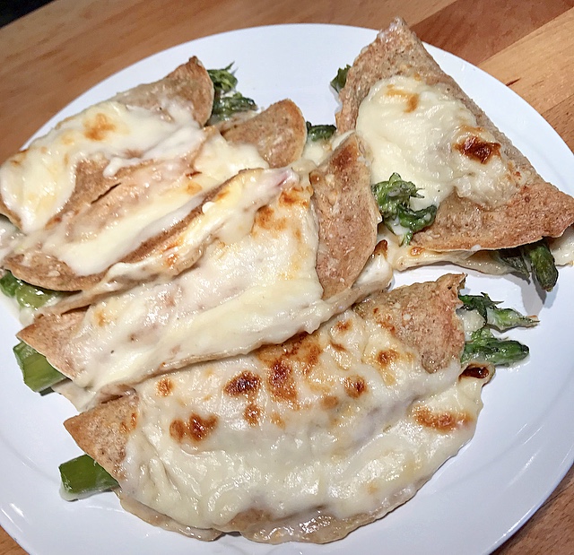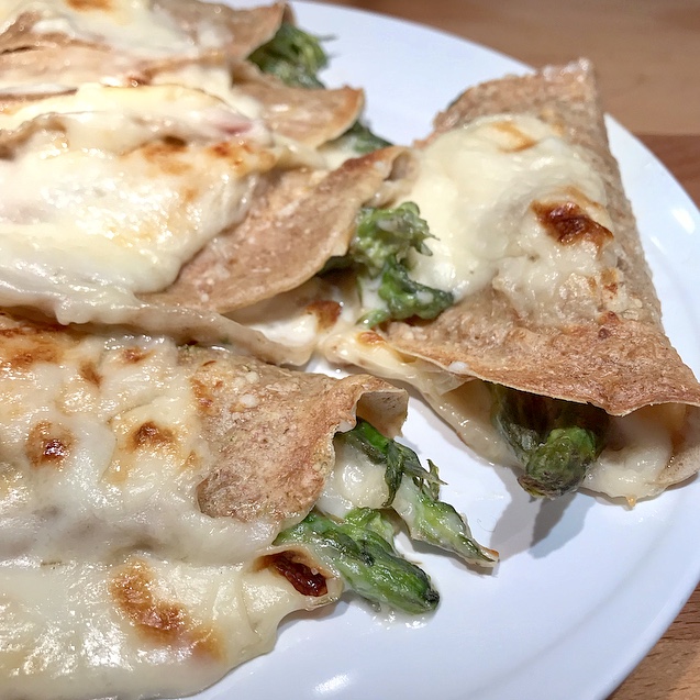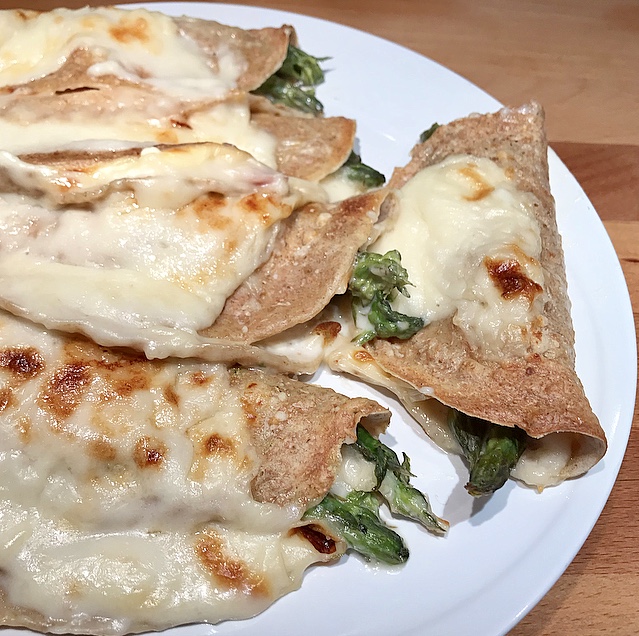 - farcire ognuna con un cucchiaio di besciamella, 2 asparagi, 1 cucchiaino di parmigiano, 1 cucchiaino di formaggio spalmabile, dadini di prosciutto e quadratini di sottilette