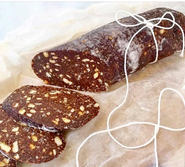 - sistemare il composto su un foglio di carta forno dando la forma del salame e poi avvolgere e riporre in freezer