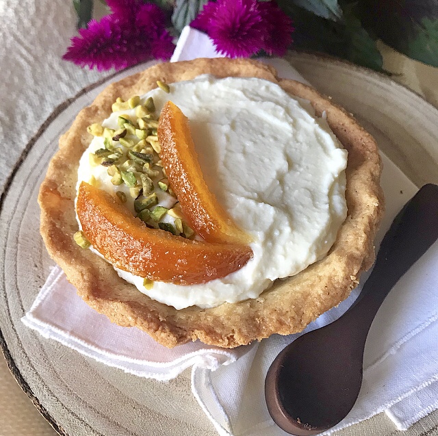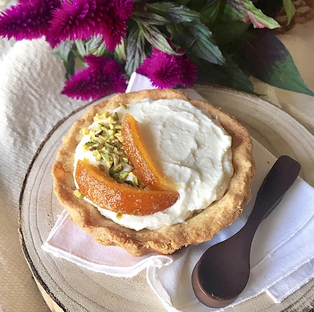 - farcire le crostate mono porzione e decorare con arance candite e granella di pistacchio