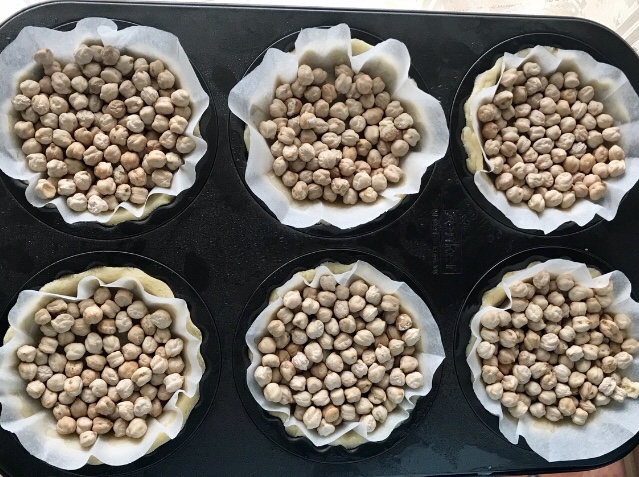- coprire con dischetti ricavati con carta forno e ricoprire con legumi secchi ( io ho scelto i ceci)
