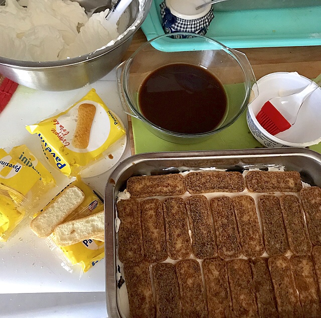 - riempire il fondo del tegame con i pavesini bagnati nel caffè, spennellati con il rum e spolverati con un po’ di zucchero semolato