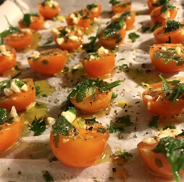 - La parola confit deriva dal francese “confire”, cioè preservare quelle preparazioni che hanno lunga cottura e per conservare il sapore del cibo. In questo caso, per la preparazione dei pomodori ciliegino si fa asciugare tutta l’acqua di vegetazione in forno a tempera bassa , questo procedimento darà ai pomodori un gusto particolare. I pomodori confit si prestano per tanti manicaretti, dalle bruschette per finire come condimento per la pasta e per accompagnare le carni bianche o rosse! La ricetta è semplice, bisogna avere pazienza per il risultato finale!