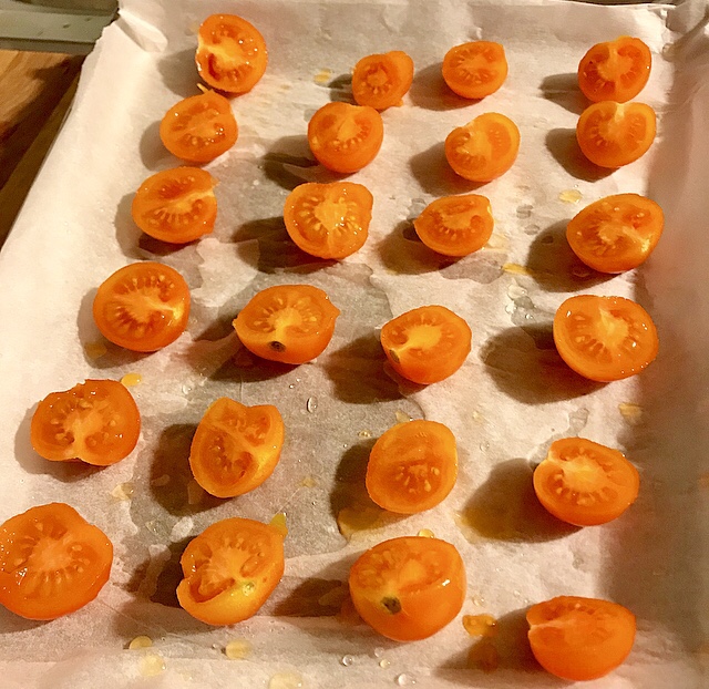 - sistemare il foglio di carta forno e adagiare i pomodori tagliati a metà