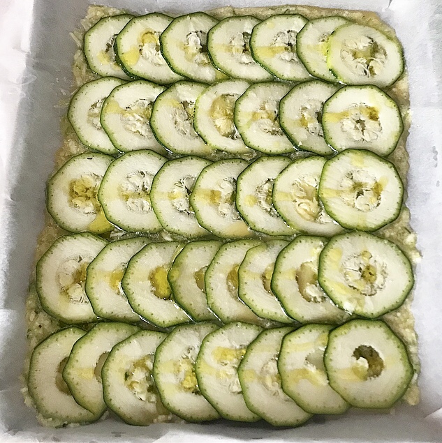 - adagiare sul composto ogni singola fetta di zucchina, sovrapponendo l’una all’altra e poi aggiungere un filo d’olio