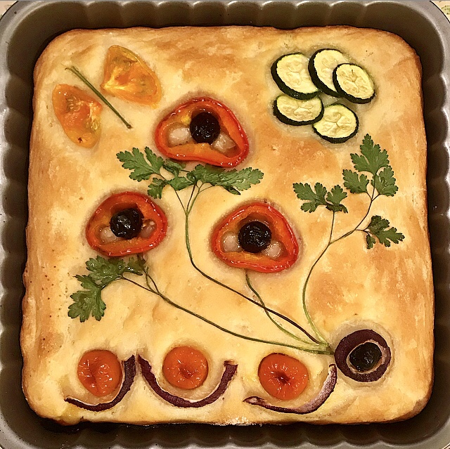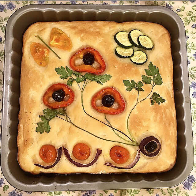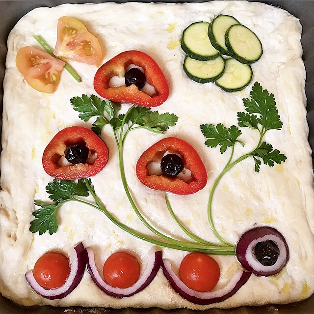 La focaccia pugliese è tipica per il suo impasto fatto con l’aggiunta della purea di patate. È morbida , soffice e alta di spessore , spesso farcita con pomodorini, cipolla ed erbe aromatiche. Questa mia versione è un po’ inconsueta, perché mi sono dilettata a decorarla come fosse un quadro. Dato lo spessore, viene tagliata al centro per essere farcita con salumi affettati.