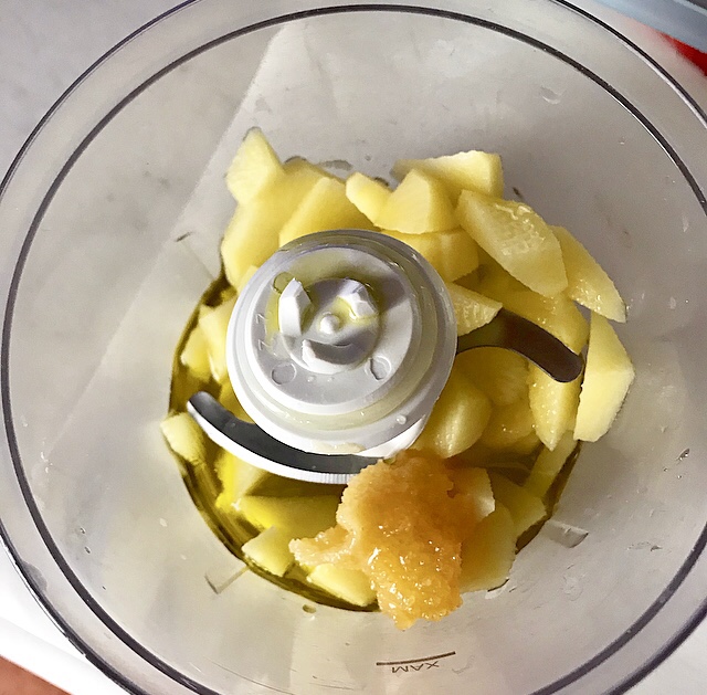 - pelare le patate crude, renderle a tocchetti, frullarle con 2 cucchiai di olio e il miele