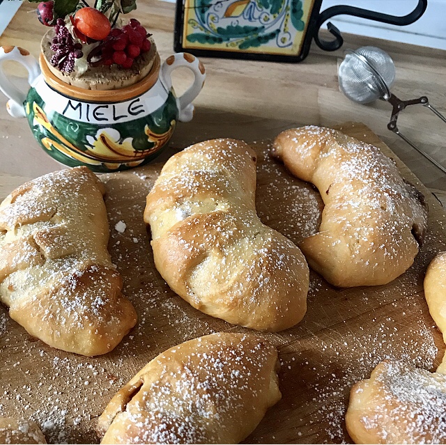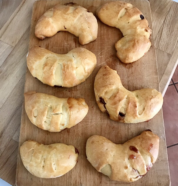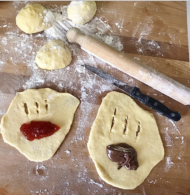 - aiutandosi con un matterello, allargare ogni singola pallina , farcire a piacere, incidere l’impasto formando 3 fessure, bagnare i lati con acqua e arrotolare su se stesso per formare il cornetto