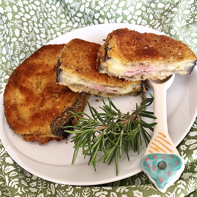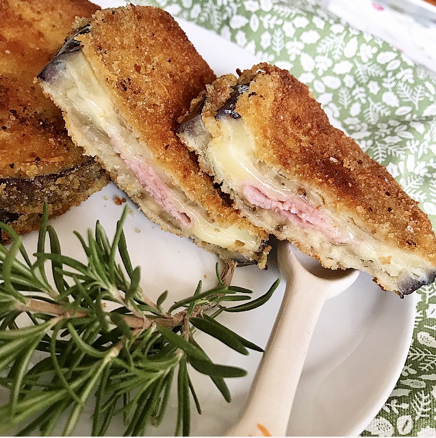 - bagnare nell’uovo sbattuto una fetta di melanzana, passarla nel pangrattato farcito da un solo lato, farcire con prosciutto cotto e caciotta, bagnare un’altra fetta e sovrapporla alla sottostante , completare la panatura