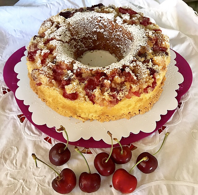 - Siamo in tema con la stagione ….le ciliegie! Come dice un vecchio detto: una tira l’altra! In questa ricetta infatti ne gustiamo tante, perché durante la cottura si trasferiscono sul fondo dello stampo a formare una deliziosa e morbida corona di ciliegie! Una ciambella golosissima per chi ama questo frutto e soprattutto soffice e morbida, proprio come piace a noi!