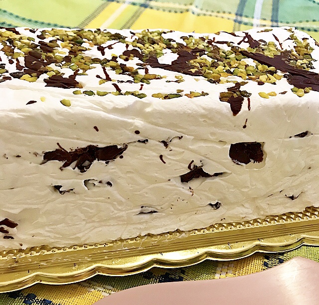- sul fondo dello stampo ( rivestito con pellicola) versare la granella di pistacchio e qualche filo di cioccolato fuso