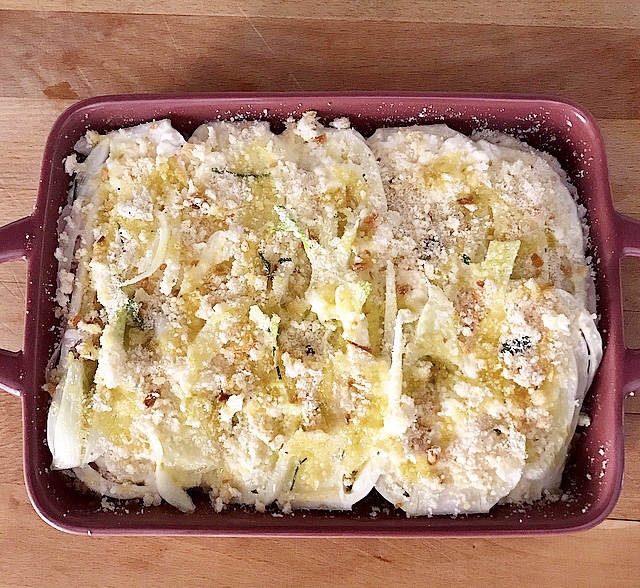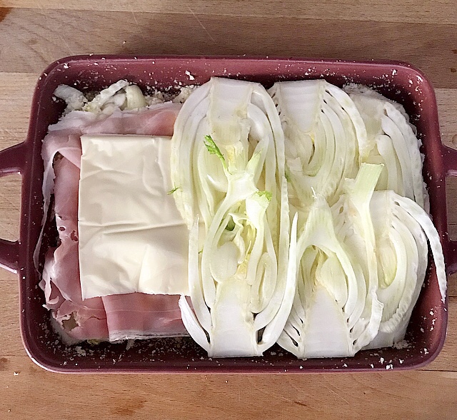 - sistemare il primo strato di finocchi con un po’ di sale e un filo d’olio evo