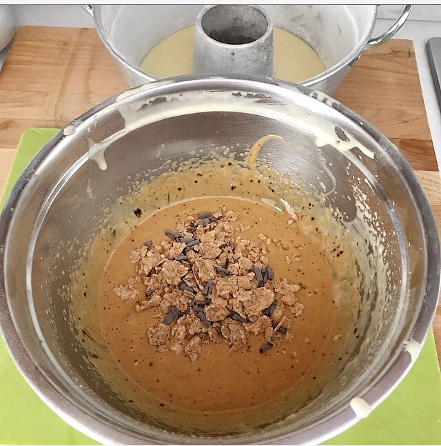- nell’altra metà restante aggiungere lo yogurt, 1 cucchiaio di caffè solubile e i fiocchi di riso e orzo + i riccioli di cioccolato fondente