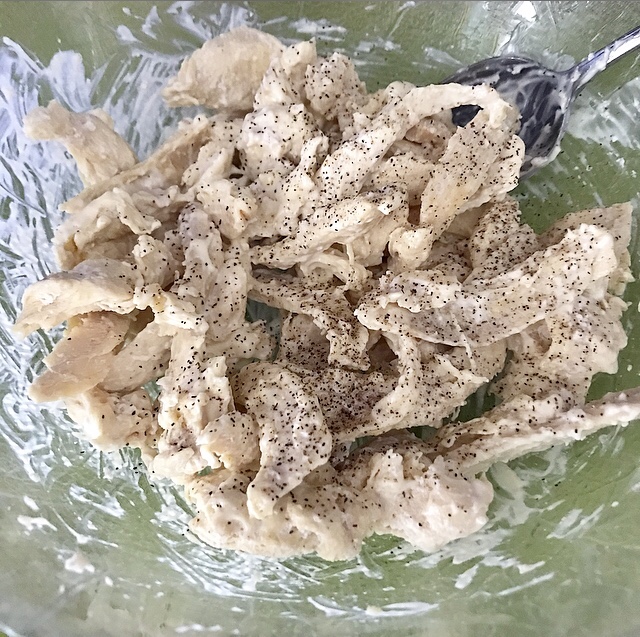 - a cottura ultimata, fare intiepidire e poi tagliarlo formando degli irregolari straccetti , condirlo con 1 cucchiaio di maionese e pepe nero macinato