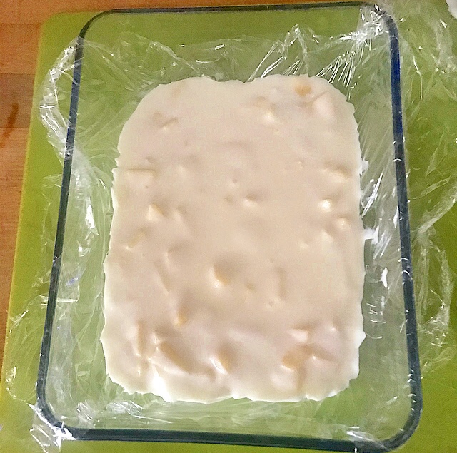- rivestire il contenitore con la pellicola e riempire con il composto ottenuto