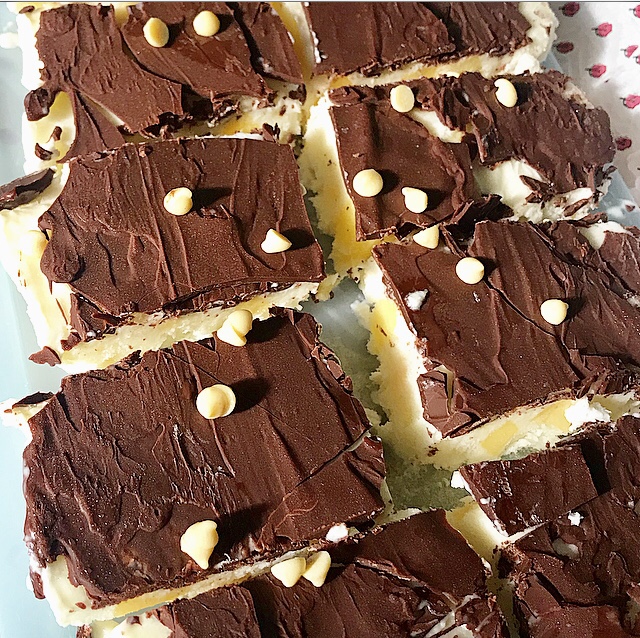- riporre il dolce nel congelatore per pochi minuti, il tempo che si compatta il cioccolato e poi tagliatelo a cubotti