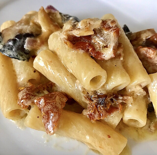 - a vostro gradimento, si può aggiungere qualche fogliolina di basilico ! La salsa rilascerà un colore rosato dato dai pomodori secchi! Quest’ultimo passaggio darà un tocco in più al momento di servire