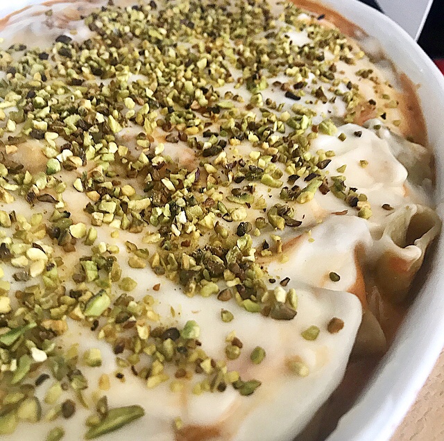 - scolare e rimettere la pasta nella stessa pentola di cottura aggiungendo il ragù con le polpettine + uova sode+ prosciutto cotto +formaggio a pasta morbida + grana+ besciamella + granella di pistacchio