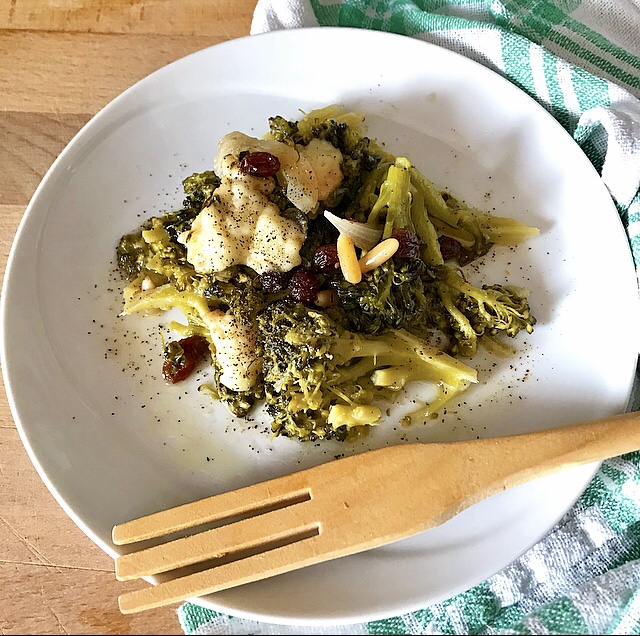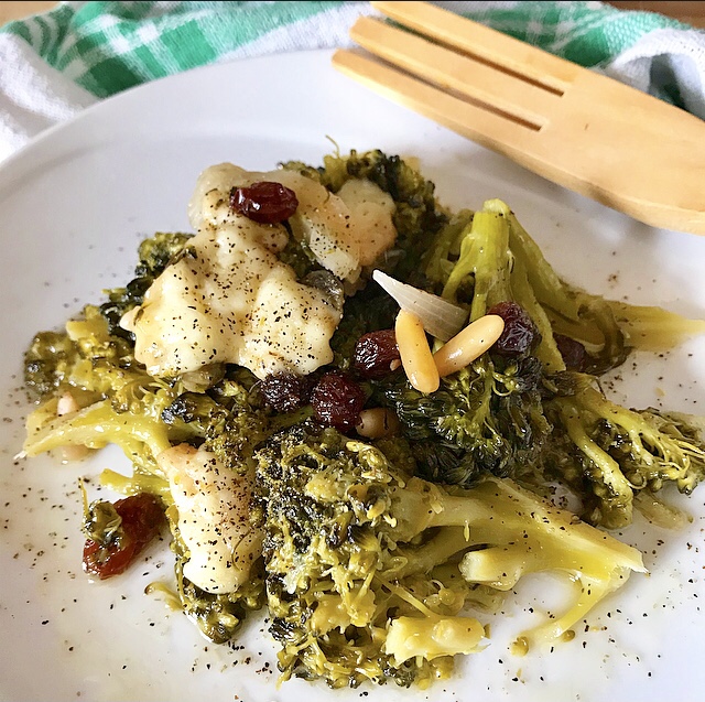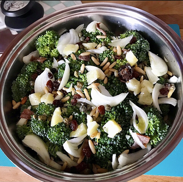 - dopo aver sistemato le cime di broccolo in tegame ( vedi post) condire con la cipolla , uva sultanina, capperi , pinoli , olio e poco sale