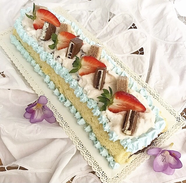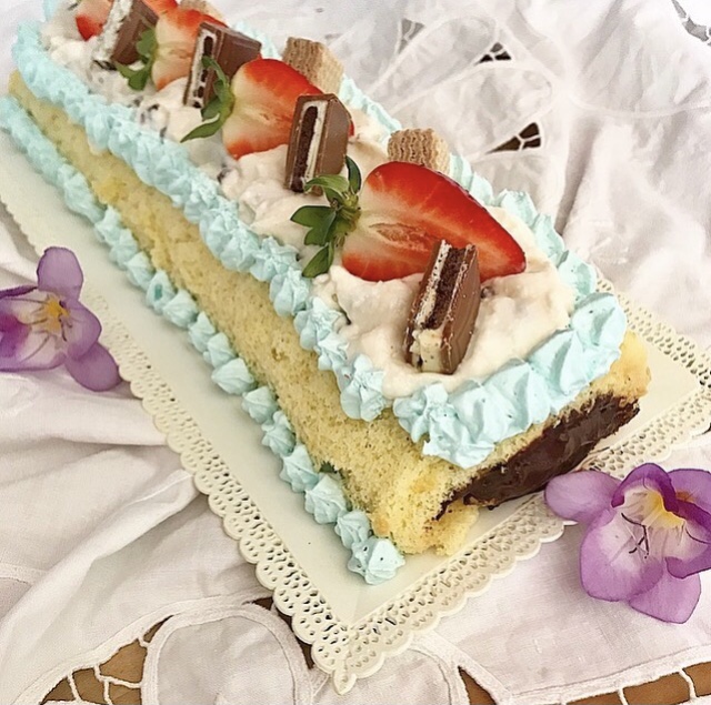 Rotolo di pasta biscotto farcito con crema al cioccolato, ricoperto con crema alla ricotta e panna. ( Trovi il link in tutte le parole sottolineate, clicca e trovi la ricetta). Un dolce goloso che sostituisce la classica torta, quindi perfetto anche per un compleanno o per altra qualsiasi ricorrenza!