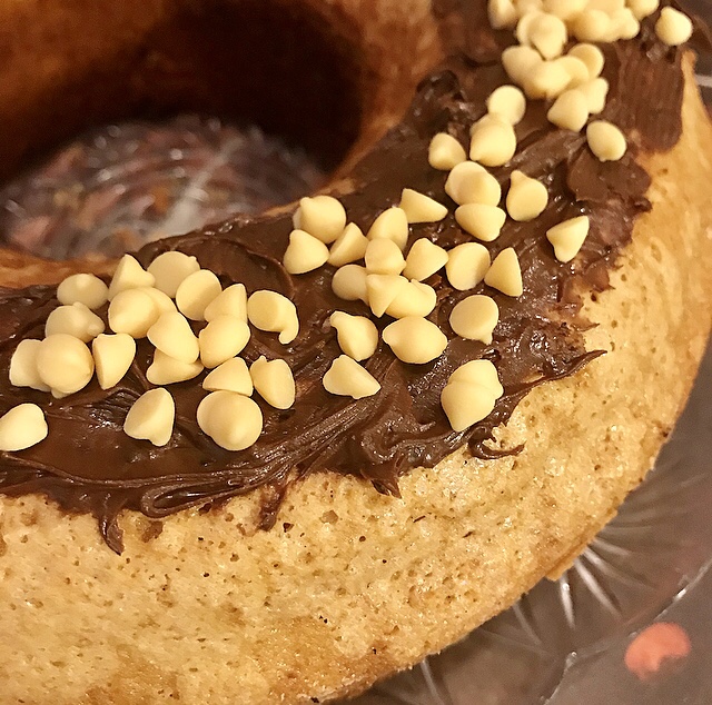 - Spalmare altra crema sopra la ciambella e guarnire con le gocce di cioccolato bianco