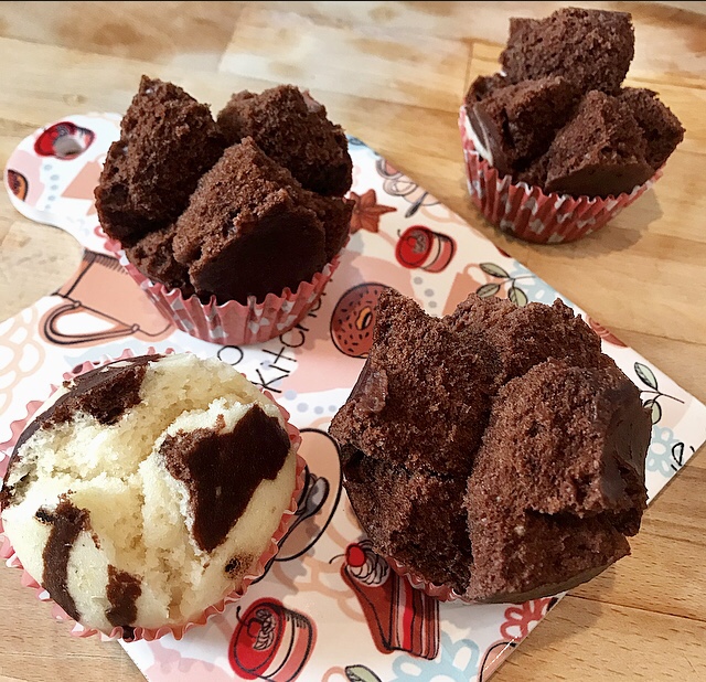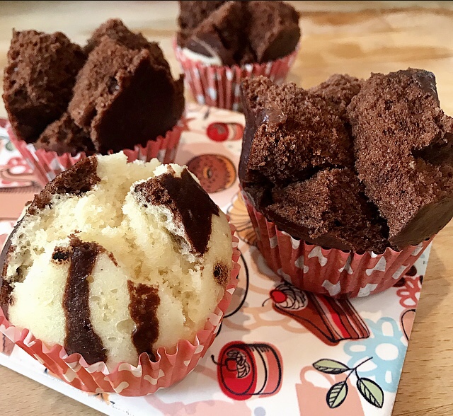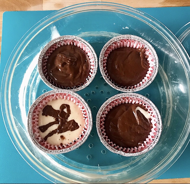 - sistemare le cartine da muffin dentro ogni pirottino e riempire con gli impasti ottenuti per 3/4 della capienza ( vedi foto) e sistemare dentro il cestello