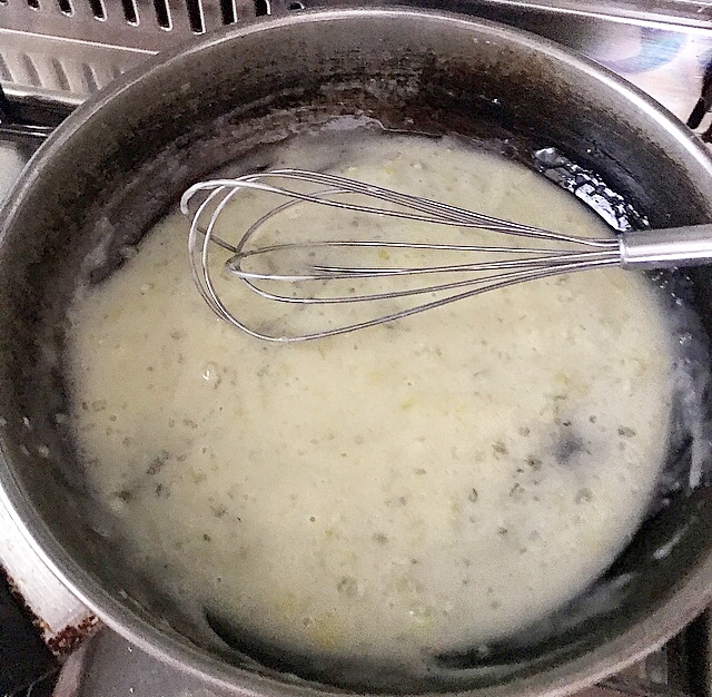 - nel frattempo, in un capiente tegame, rosolare l’aglio e poi aggiungere il succo dei 2 limoni, continuare aggiungendo le scaglie di peperoncino e infine la fecola di patate ( quest’ultima permetterà di formarsi una deliziosa cremina che scioglierete con un po’ d’acqua di cottura della pasta)