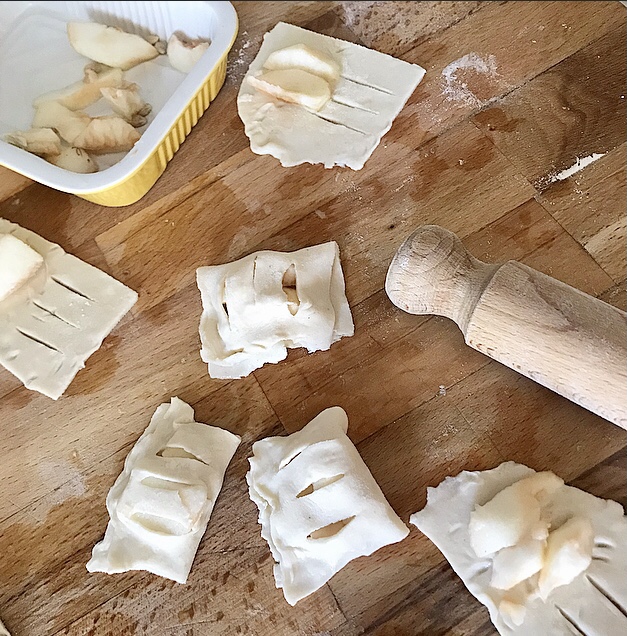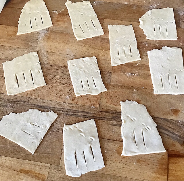 - stendere la pasta sfoglia ( come spiegato nel link ) e ricavarne dei piccoli rettangoli dove all’estremità inciderete con la punta di un coltello